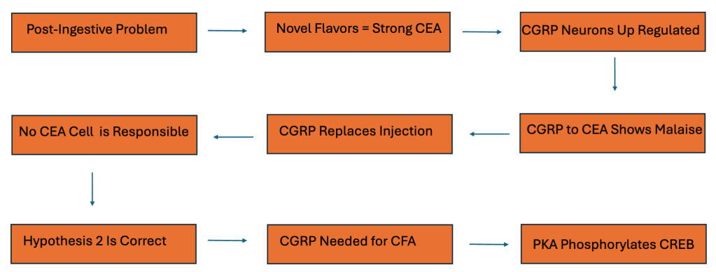 A post-ingestive problem follows a novel flavor, which builds a strong representation in the central amygdala. CGRP neurons then rise in activity, and delivering CGRP input to the CEA produces a malaise signal that can stand in for the usual LiCl injection. Because CGRP can substitute for the injection, no single CEA cell group alone accounts for the effect. Taken together, these results support Hypothesis 2: CGRP signaling is required for conditioned flavor aversion, with PKA phosphorylating CREB to prime CEA neurons for plasticity and long-term memory.