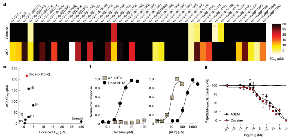 The group reworked ligand-gated ion channels so that cocaine becomes the key that opens them. They started from an α7 nicotinic acetylcholine receptor binding pocket and grafted it onto cation (5HT3) and anion (GlyR) pores. The result is a pair of cocaine-gated switches for excitation or inhibition. In Fig. 1d–g, you can see how successive mutations raise cocaine potency while dropping acetylcholine sensitivity, leading to the final excitatory channel, coca-5HT3, with low-micromolar cocaine activation and weak responses to endogenous agonists.