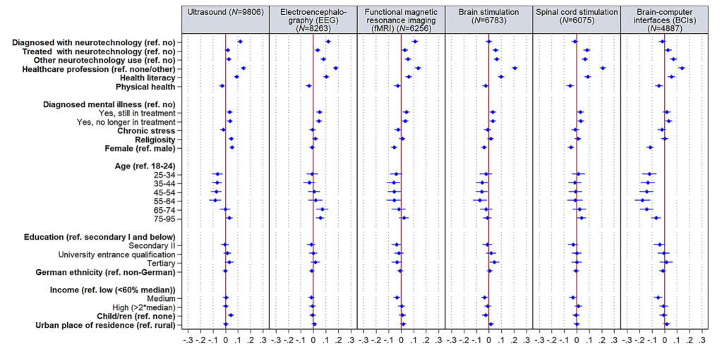 Figure 2 models who is more likely to have heard of each technology. Prior diagnostic use shows large odds for ultrasound and EEG and moderate odds for fMRI. Treatment experience adds smaller but positive odds for EEG, fMRI, brain stimulation, and spinal cord stimulation. “Other” uses, such as nonmedical applications, show medium positive effects across the board and a large effect for fMRI. Working in a health-care job is a strong predictor across technologies.