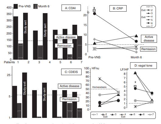 Figure 5 summarizes a small pilot in active Crohn’s disease with 7 patients reported at 6 months (out of 9 enrolled) and a 1-year follow-up plan. Patients were selected using clinical activity (CDAI), inflammatory markers (CRP and or fecal calprotectin), and endoscopic severity (CDEIS). The figure tracks changes in CDAI, CRP, CDEIS, and autonomic markers of vagal tone and sympathovagal balance over 6 months, with remission cutoffs stated for each metric.