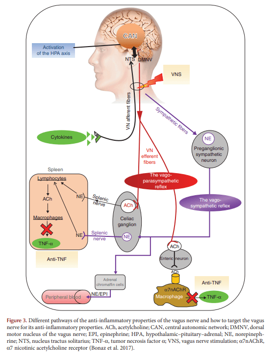 Figure 3 lays out how the vagus nerve can reduce inflammation through (at least) two coordinated strategies: